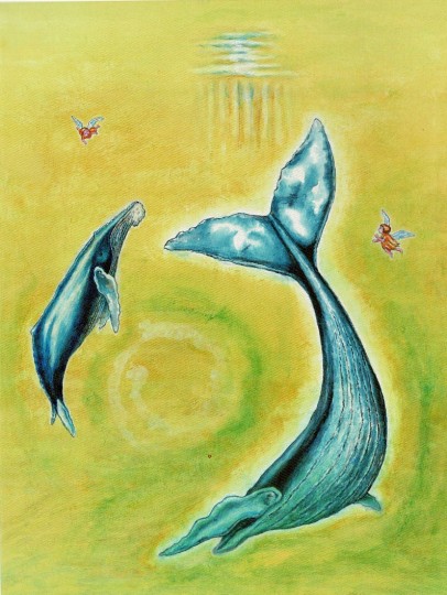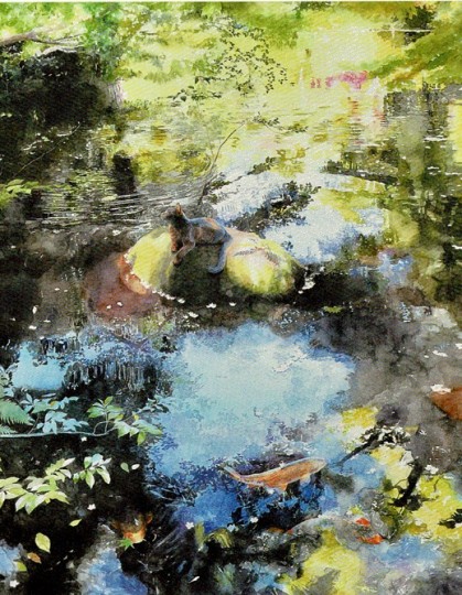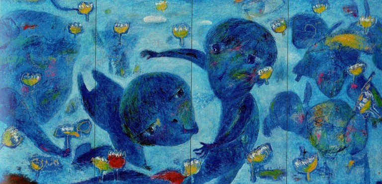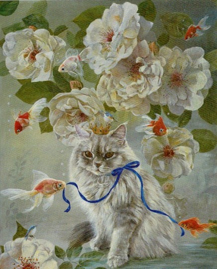 岡田 富士子:猫と金魚(青い鳥)