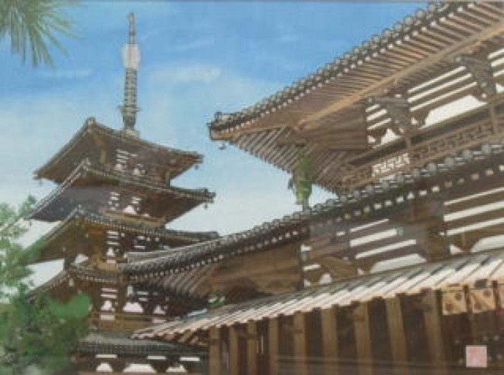 石渡 健三:「日本最古の木造建築」 切絵 大全紙