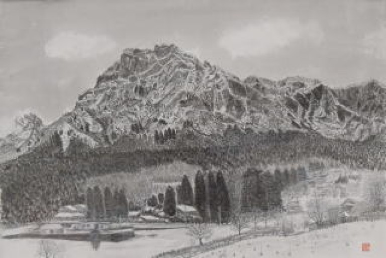 高櫻 誠:「白雲山(群馬妙義山)の初雪」 ペン画 F20