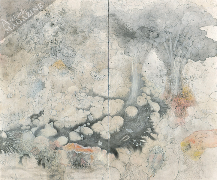 テーマやモチーフは、描き始めの段階ではあまり用意していないことが多いです。思い切って何か描き始めて、どんな精神なのかとか考えながら造形や肉付けしていくうちに、普段興味を持っている事や神話など物語とイメージが繋がって発展していき、これでいこうと決まる感じです。最近はインド思想や神話の本など読んでいるので、それが絵に出てきています。